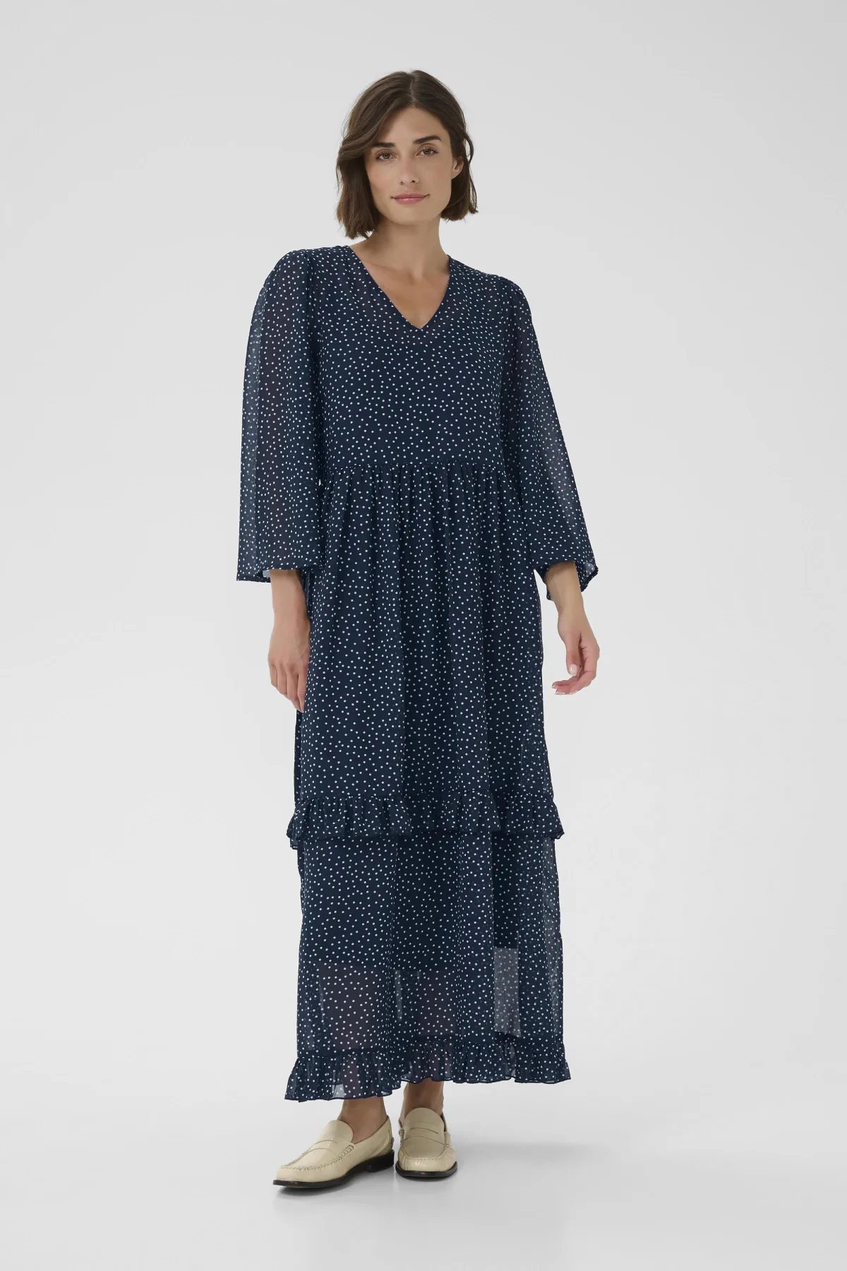 Luchtige, gelaagde jurk met rechte pasvorm, subtiele V-hals en transparante 3/4 mouwen. Ankle-lengte, afgewerkt met fijne ruches.