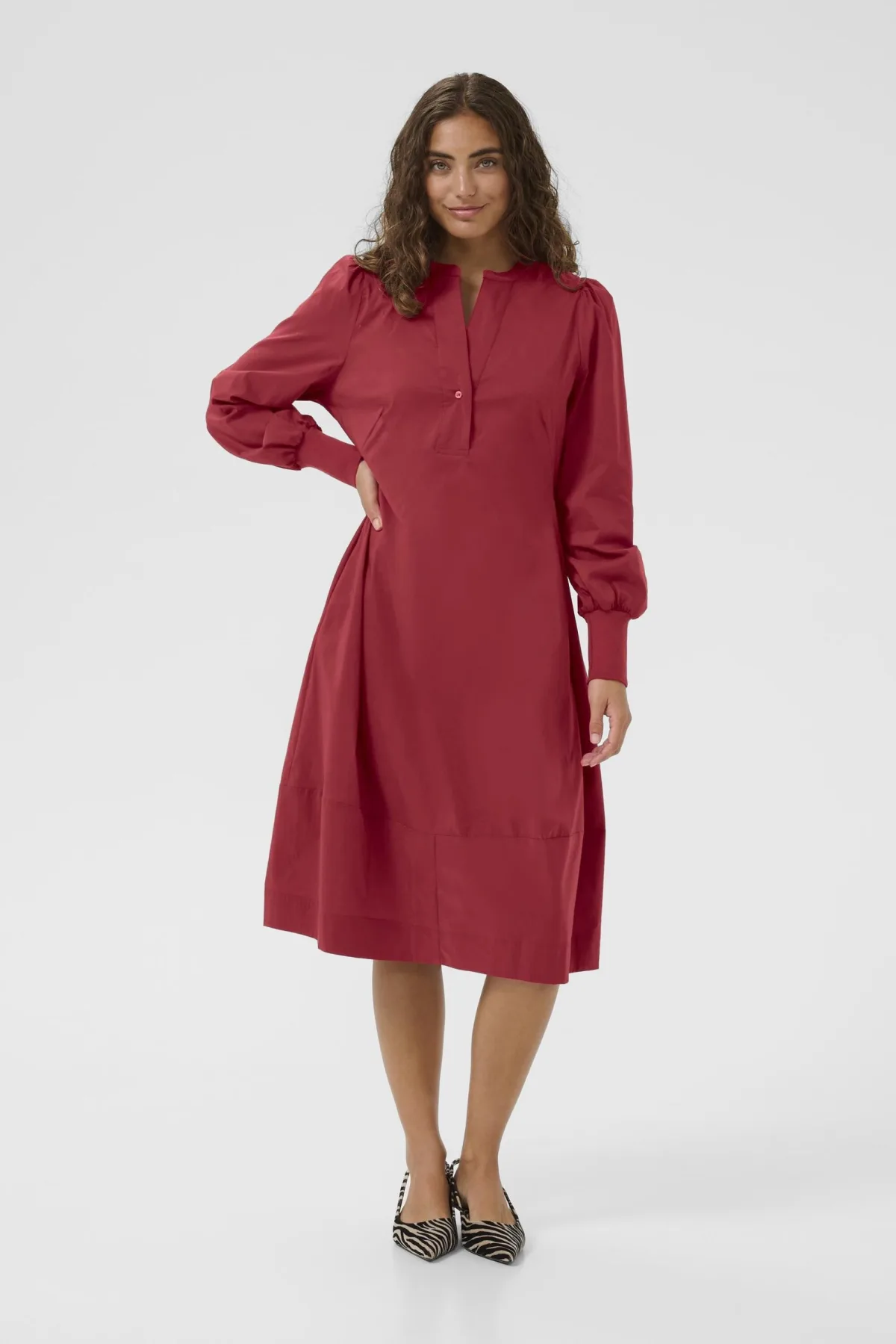 Elegante jurk met een relaxte pasvorm. De jurk heeft een knoopsluiting aan de voorkant en brede ribboorden aan de mouwen. Licht gepofte schouders en een naad op de rug zorgen voor een flatterend silhouet. Verkrijgbaar in meerdere kleuren, en alle modellen dragen maat M.