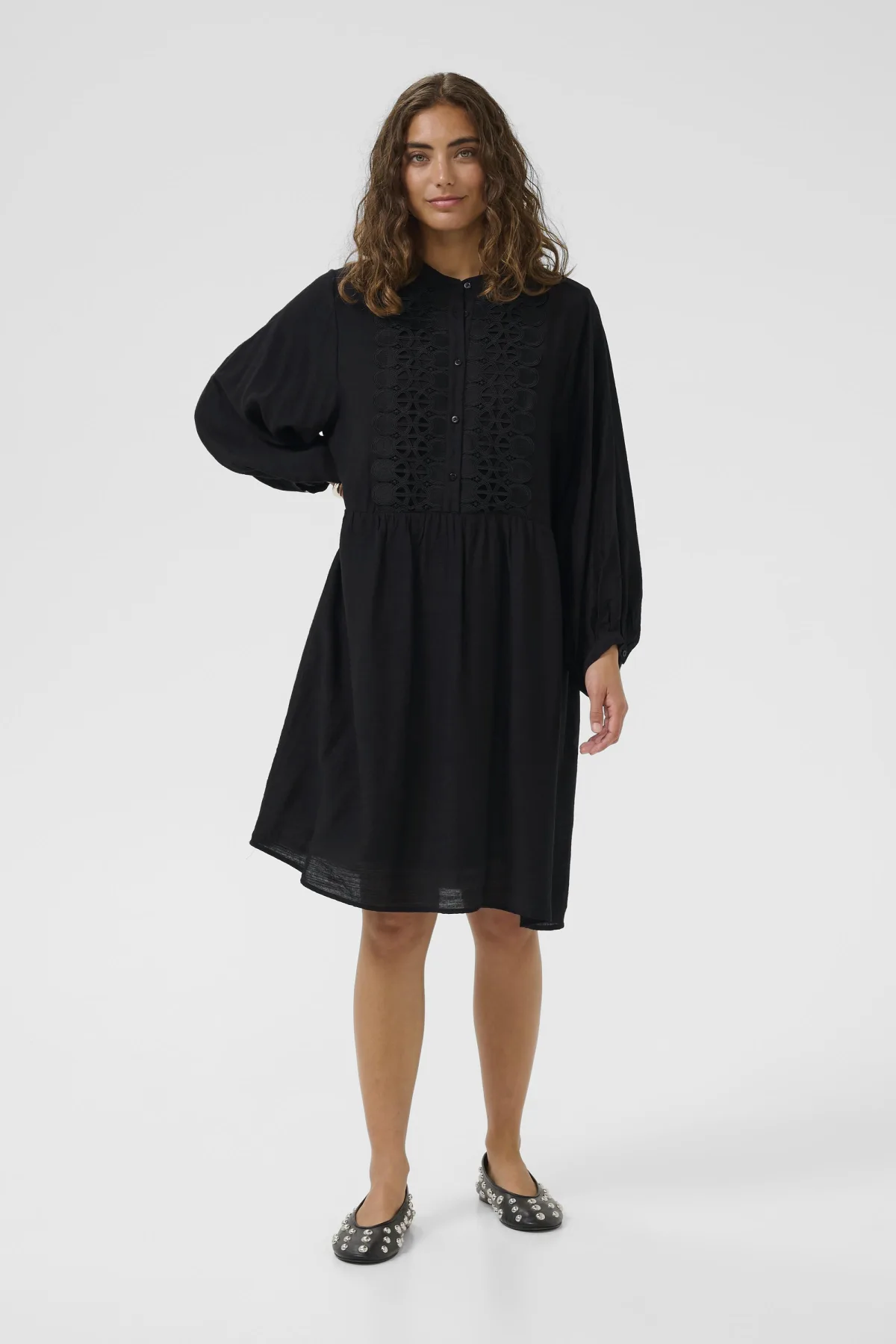Deze jurk in een comfortabele pasvorm heeft een geborduurd voorpand, ronde hals, knoopsluiting en lange ballonmouwen. Geschikt voor verschillende gelegenheden.