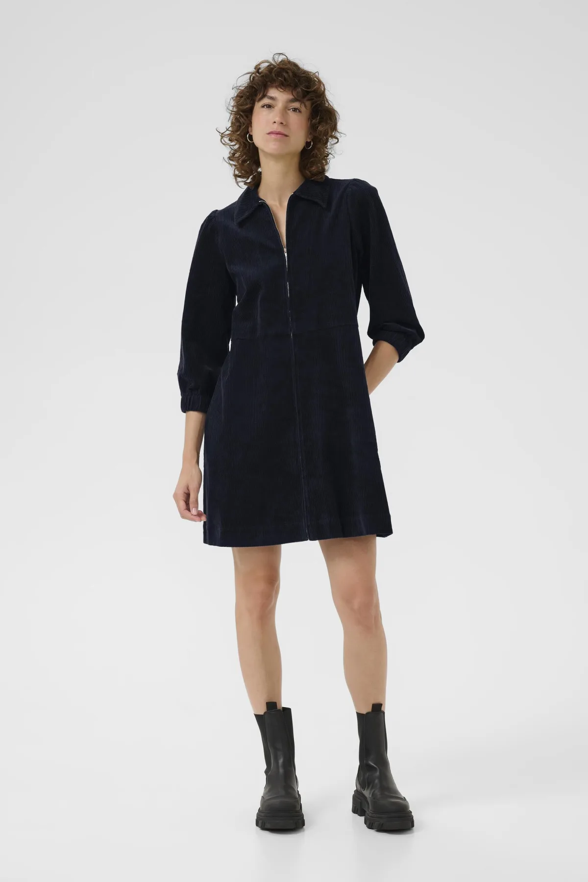 Deze corduroy jurk heeft een rechte pasvorm, klassieke kraag en driekwartmouwen met elastieken boorden. De ritssluiting aan de voorzijde zorgt voor gemak en een eigentijdse uitstraling, geschikt voor diverse gelegenheden. Wassen op 30°, niet bleken, niet in de droger drogen, Druipnat ophangen in de schaduw, warm strijken max. 150° C, 83% Katoen,15% Viscose,2% Elastaan