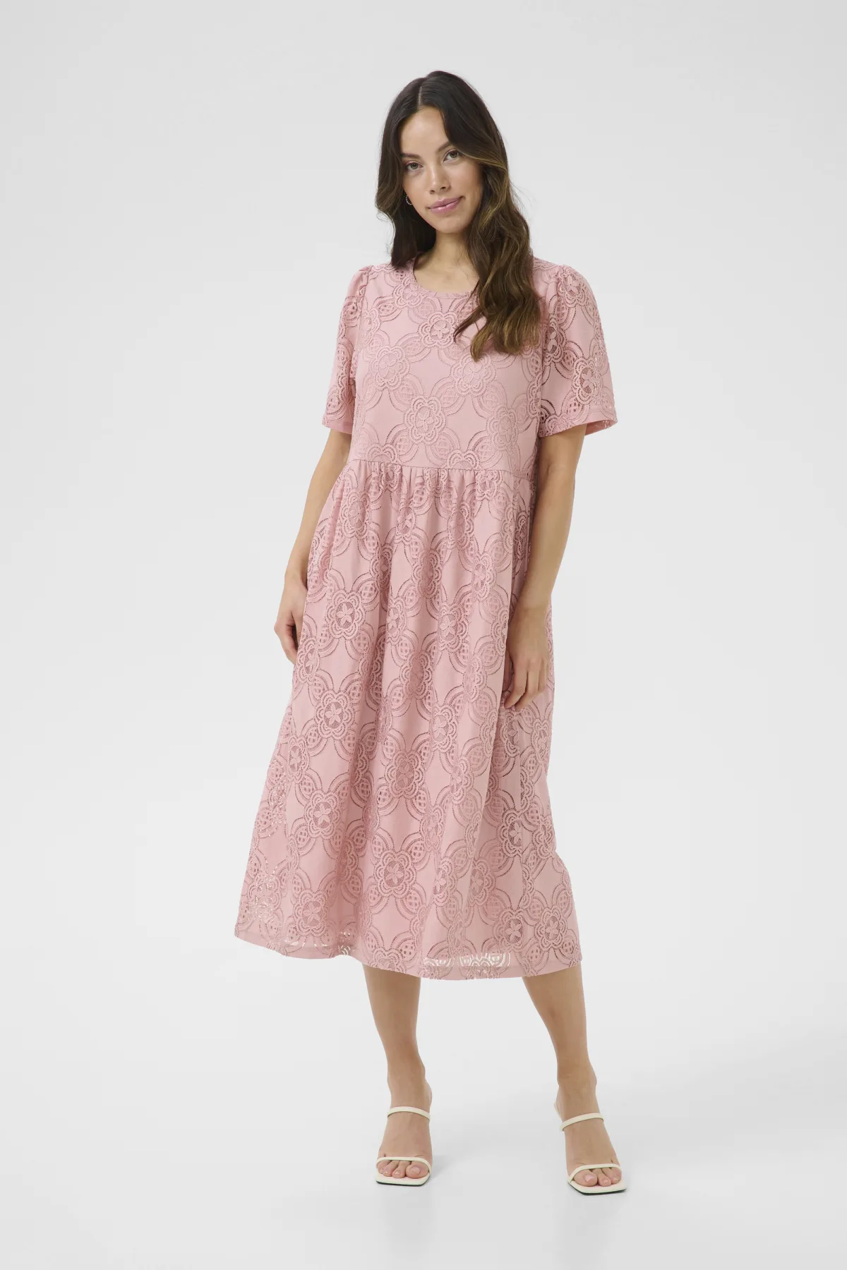 Midi-jurk van kant met een luchtige en zacht getextureerde afwerking, ronde hals en licht uitlopende silhouette. Inclusief korte mouwen en een geplooide taille voor een vrouwelijke uitstraling.
