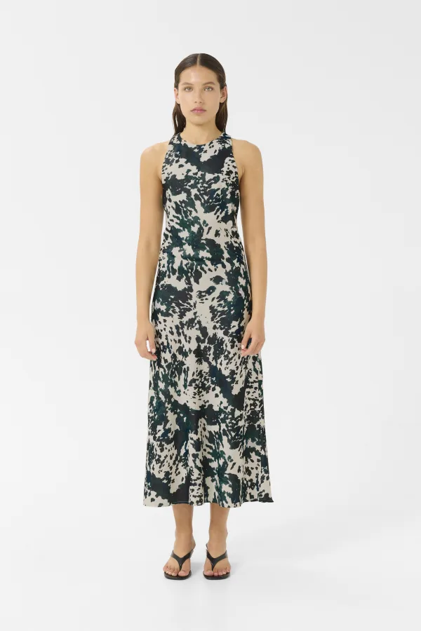 Mouwloze midi-jurk met een licht uitlopend A-lijn silhouet, hoge hals en een soepelvallende look. All-over abstract dessin geeft een moderne uitstraling.