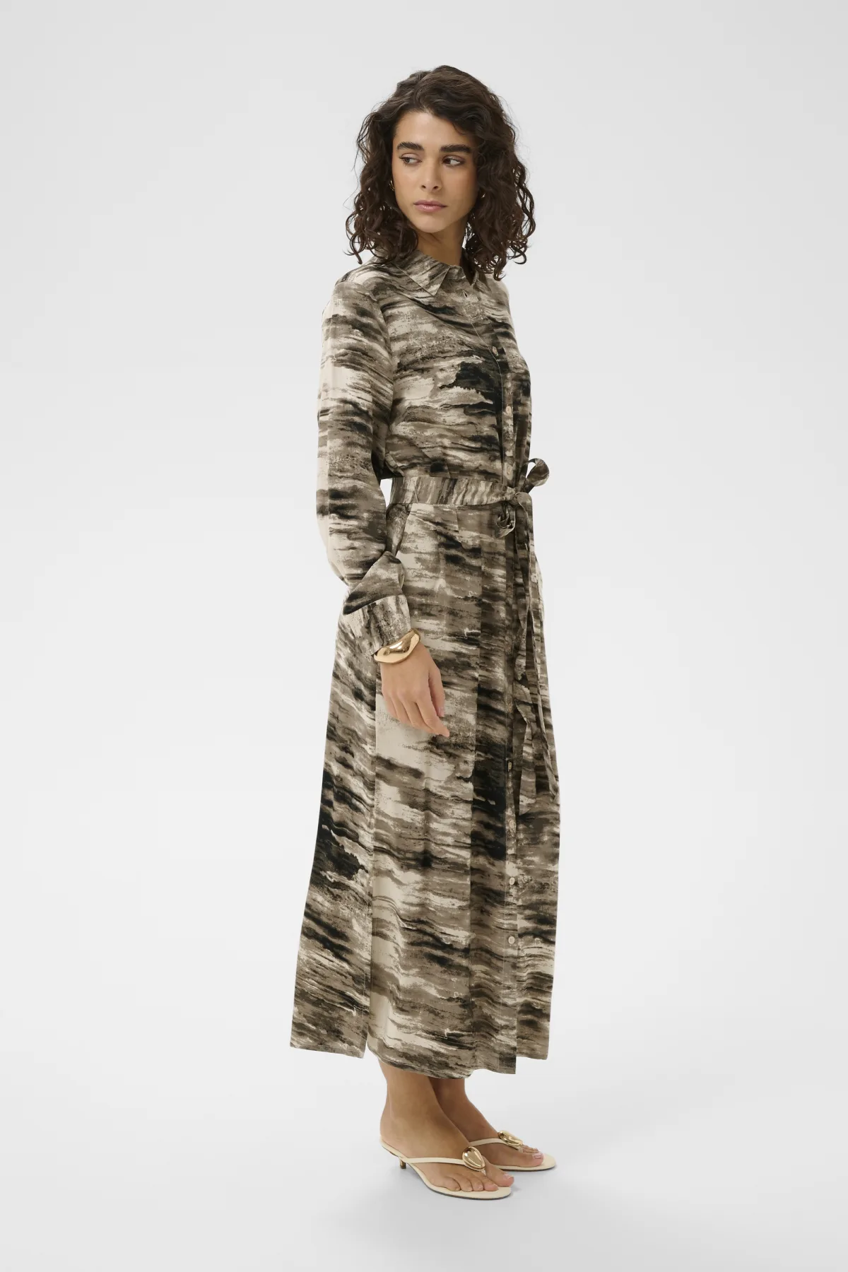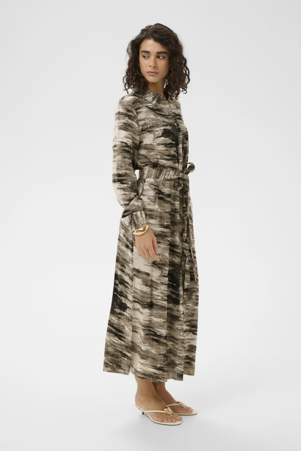 Shirtjurk met rechte pasvorm, klassieke kraag, doorknoopsluiting, lange mouwen en strikceintuur. Midi-lengte en zachte uitstraling.