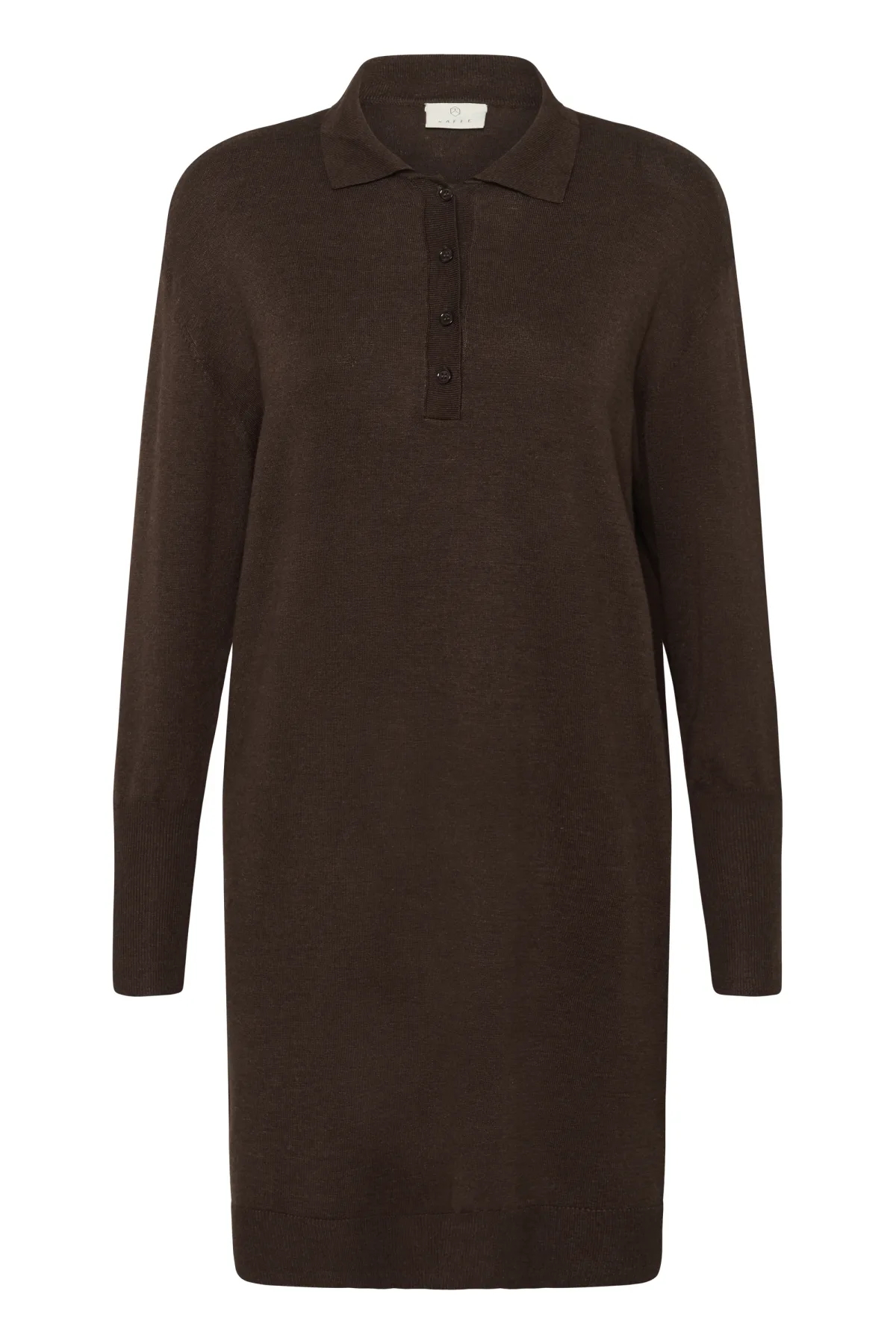 Gebreide jurk met comfortabele pasvorm, klassieke polokraag, knoopsluiting en lange mouwen. Knie-lengte ontwerp ideaal voor dagelijks en kantoor gebruik. Fijne was 30°, niet bleken, niet in de droger drogen, Liggend laten drogen in de schaduw, koud strijken max. 110° C, 80% Viscose,20% Nylon