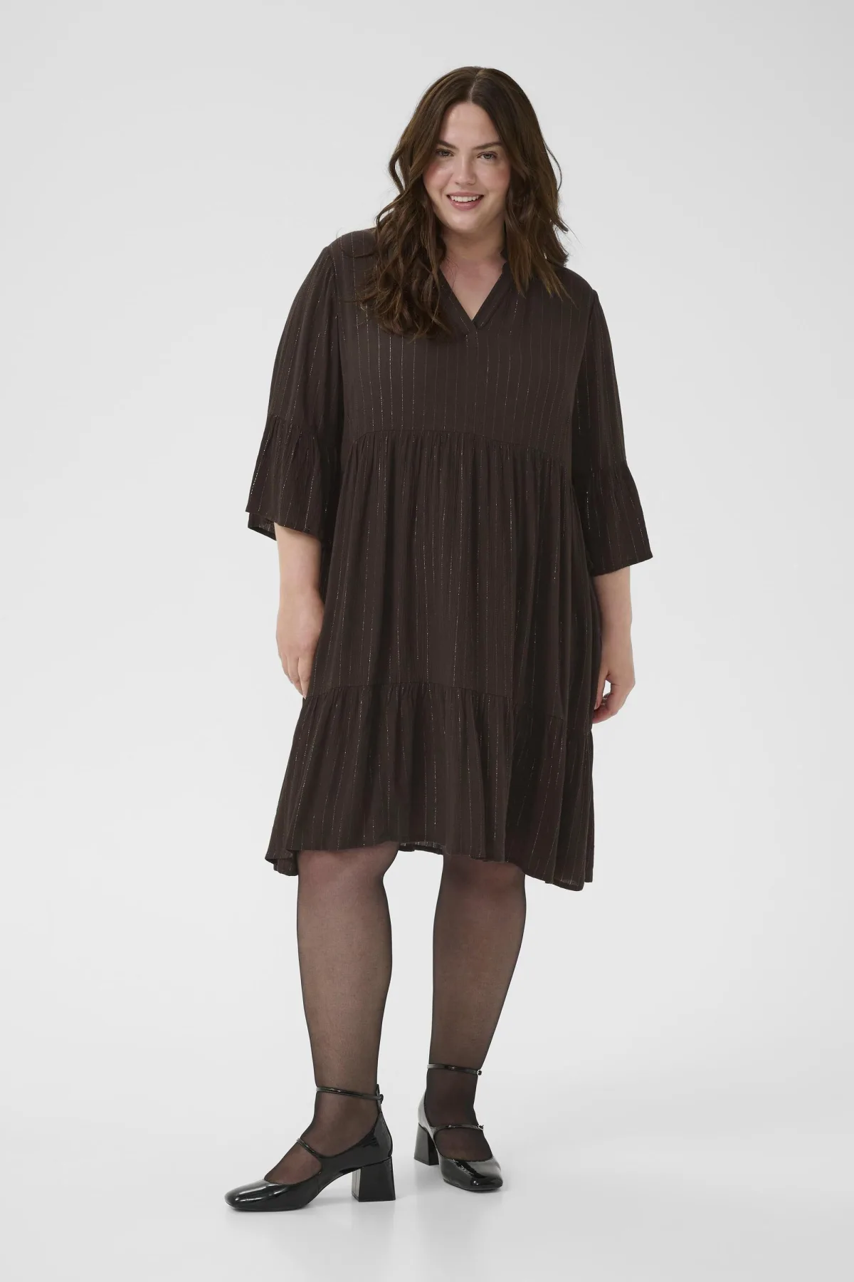 Deze jurk biedt een comfortabele, losse pasvorm en gelaagde look met een v-hals en driekwart mouwen met ruches. Geschikt voor diverse gelegenheden.