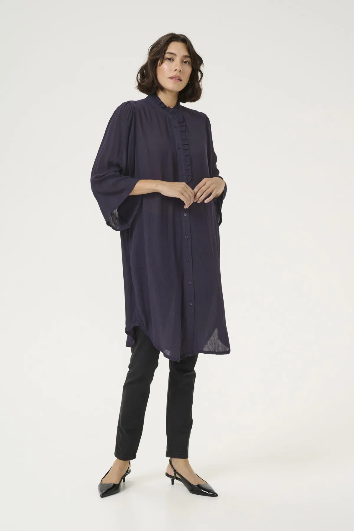 Type sluiting: Knoopsluiting; Materiaal: Viscose; Motief: Effen; Kraag: Opstaande kraag; Details: Ruches, Gedrapeerd; Lengte: Knielengte; Pasvorm: Losse pasvorm; Armlengte: Driekwart mouw