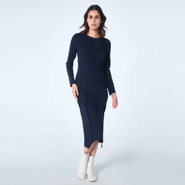 Een asymmetrisch kledingstuk met een originele structuur: een reeks omgekeerde naden die dwars langs het lichaam lopen en het silhouet energiek maken. De jurk heeft een gebogen zoomlijn die aan de zijkanten uitloopt. Gemaakt van comfortabel stretchmateriaal. Een statement-stuk voor semi-formele gelegenheden zoals cocktailparty's of diners. Productdetails: Vorm: dicht bij het lichaam/aangepast Lengte: 122 cm Lange mouwen Ronde halslijn Onzichtbare ritssluiting middenachter