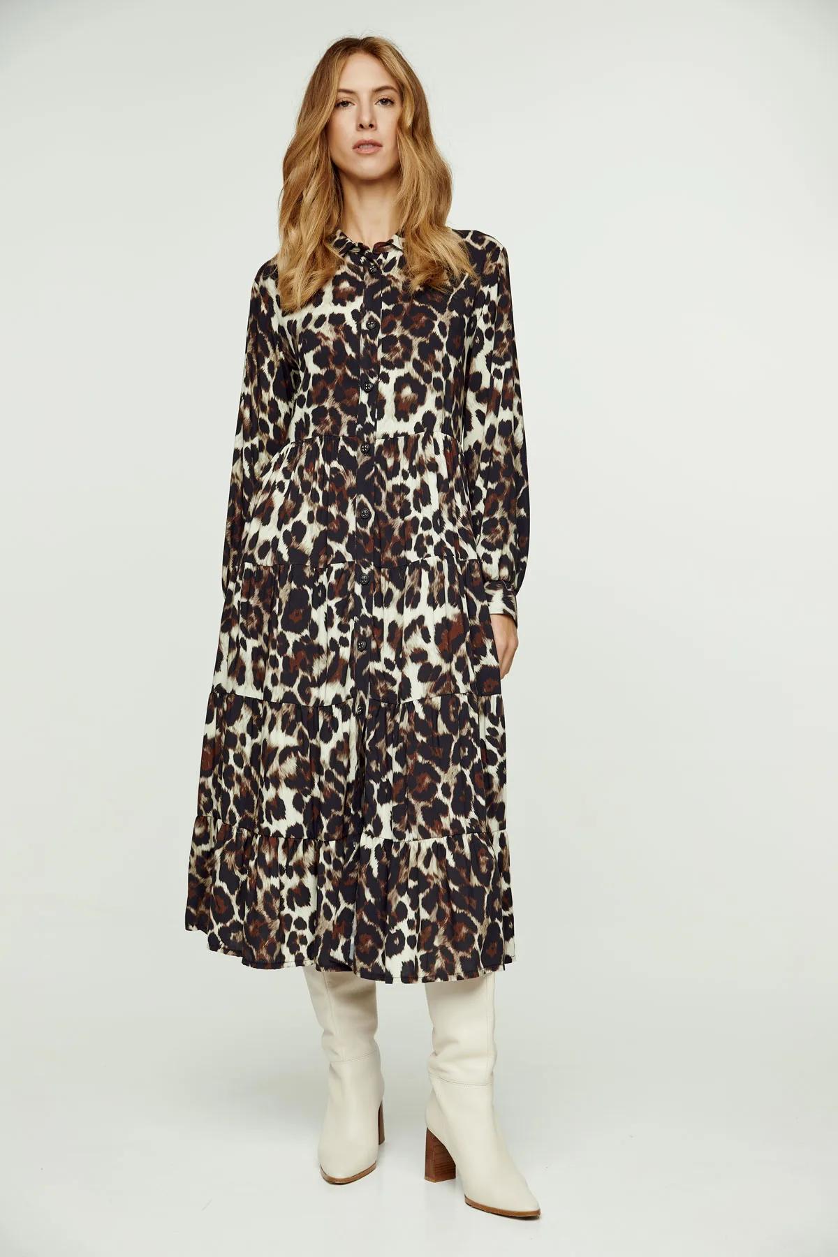 Deze jurk met dierenprint is gemaakt van geweven viscose. Het heeft een kraag en lange mouwen met manchetten in dezelfde stof met plooien. Er is een doorlopende sluiting aan de voorkant met plastic knopen toon op toon. De jurk heeft 20 cm brede plooien vanaf de taille naar beneden waardoor een los silhouet ontstaat.