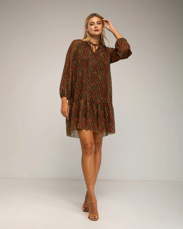 Jurk met geometrische print, uitlopende zoom en vetersluiting