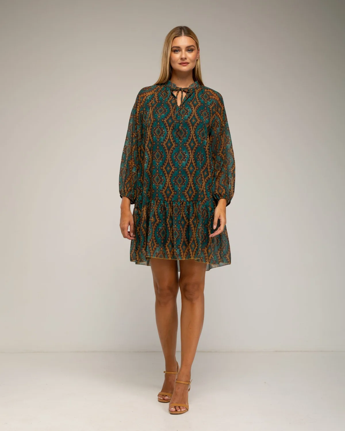 Jurk met geometrische print, uitlopende zoom en vetersluiting.