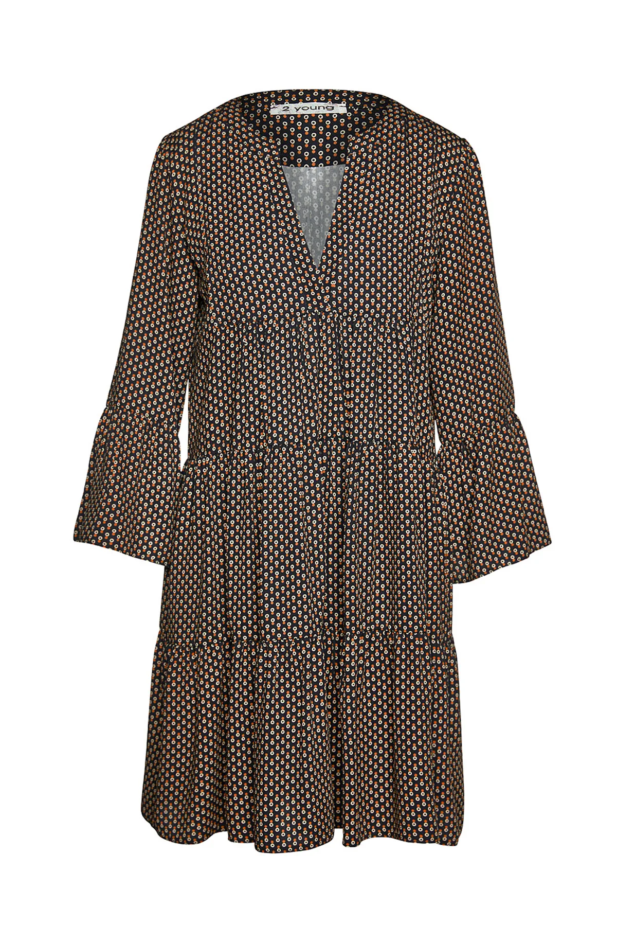 Jurk met geplooide naden van geweven stof, 100% viscose. Driekwart klokmouwen. Ronde hals met een V-opening van 24 cm aan de voorzijde. Drukknoop aan de binnenkant onderaan de V om te voorkomen dat deze te veel opent. Langwerpige dubbele stof onder de V-opening aan de voorkant. De jurk heeft twee 24 cm brede, geplooide panelen. Dubbele plooi aan de achterkant. Losvallend A-lijnmodel. Valt boven de knie.