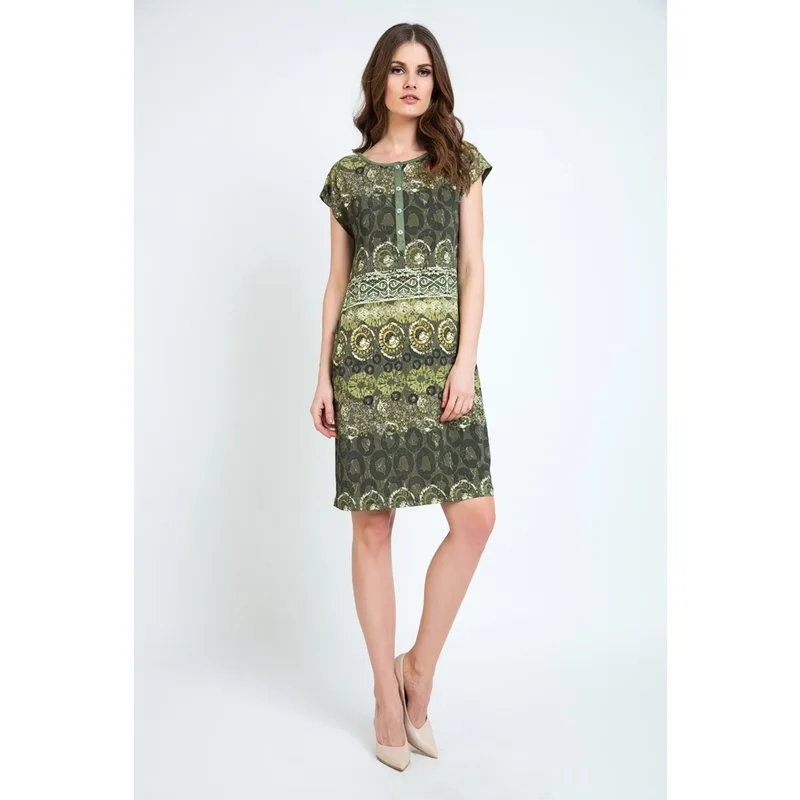 Zomerjurk in een stof met stretch jerseyprint en rayon-elastan. Mouwloos en een ronde hals met een effen kaki bies. Sluiting aan de voorkant in effen kaki satijnachtige stretchstof met vier knopen. Steekzakken in de taille met een effen kaki bies in satijnachtige stretchstof. Breed horizontaal paneel achter op de schouders in effen kaki bies in satijnachtige stretchstof. Een plooi onder het paneel. Sack silhouet. Lengte voor maat 38: 98cm.