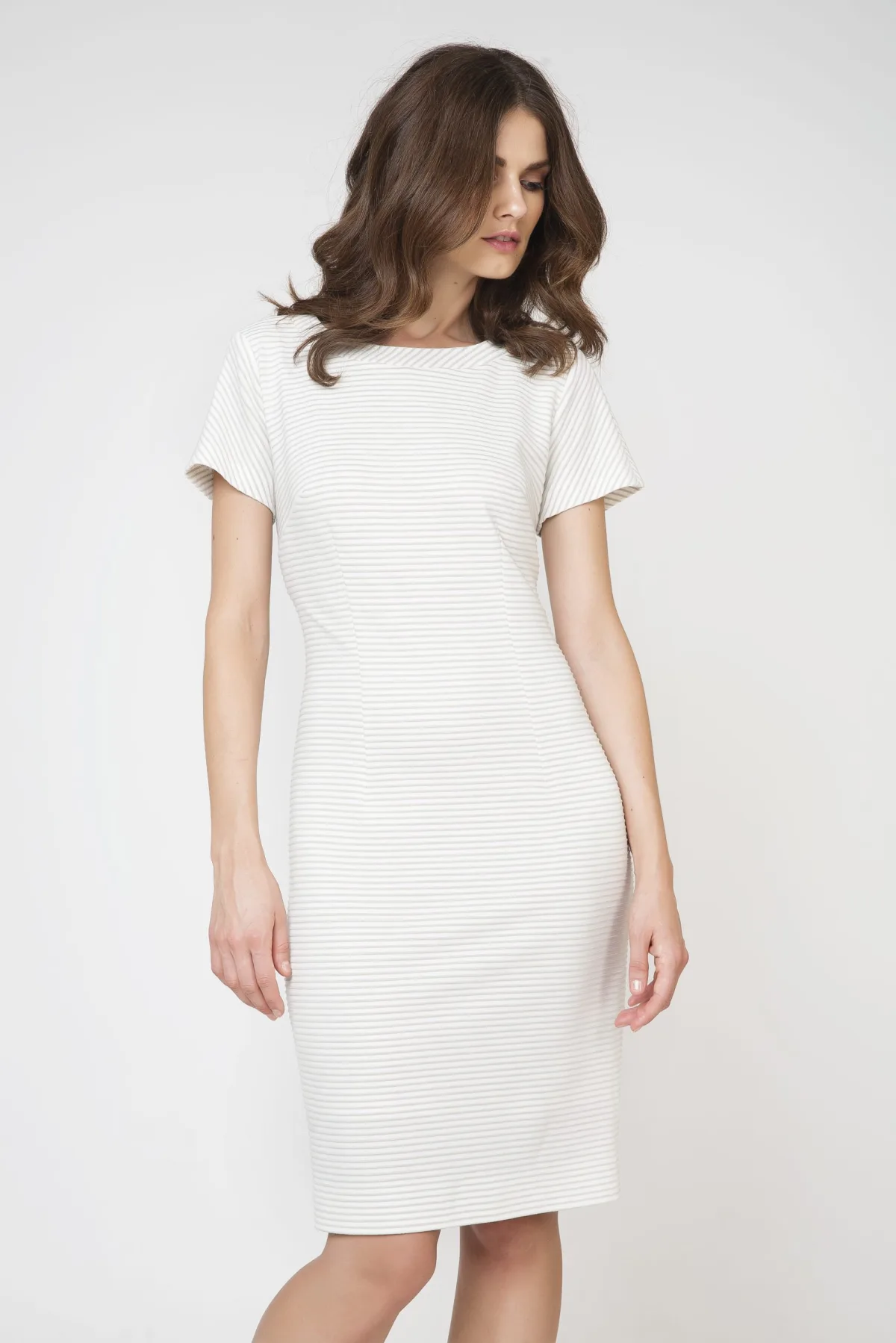 Jurk met korte mouwen van gevoerde gebreide stof van het type punto di roma. Darts op de borst. Ronde halslijn met bies in dezelfde stof diagonaal gesneden. Verborgen ritssluiting op de rug. Extra horizontale naden in de taille, 2 voor en 2 achter, voor een betere pasvorm. . Split van 19 cm achteraan in de zoom. Aansluitend silhouet. Volledig gevoerd in crèmekleurige stof. Lengte voor maat 38: 100cm