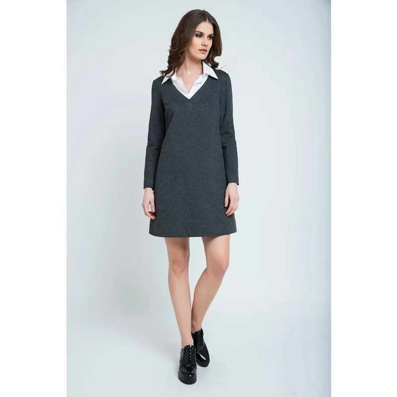 Jurk met lange mouwen in een A-lijn silhouet. Kraag in overhemdstijl die de indruk wekt van lagen in contrasterende witte katoen/elastaan popeline stof. 2 figuurnaden bij de buste. De jurk is gemaakt van gemêleerd Punto di Roma. Gevoerd. Lengte jurk voor maat 38: 94cm. Extra stof aan de zoom maakt het mogelijk om de jurk tot 4 cm te laten zakken. Ons model is 178cm en draagt maat 36.