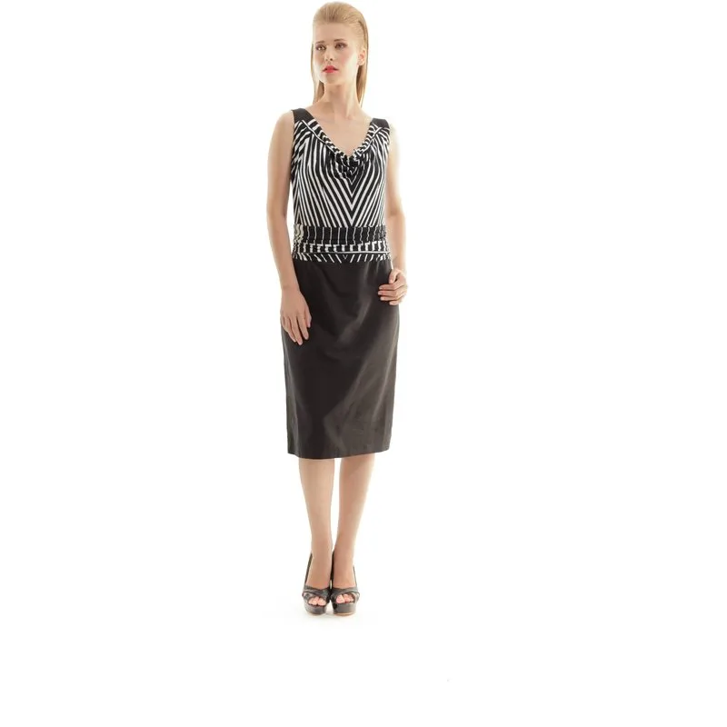 Deze prachtige jurk met kraaghals van Conquista creëert de illusie van een scheiding doordat contrasterende stoffen en prints samensmelten tot één geheel. Een weelderig zacht lijfje met zwart-witte print in luchtige stretchstof mondt uit in een zwarte A-lijn rok. Elastische zijkanten in de taille voor een getailleerde look. Kraag. Mouwloos. Het getoonde model is 178 cm en draagt maat 36/S.