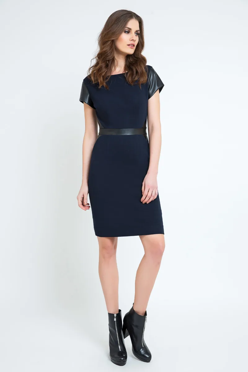 Donkerblauwe jurk van stretch Punto di Roma-stof. Ronde halslijn. Kapmouwen in kunstleer. Decoratief kunstleren detail bij de taille. Plooien bij de borst en boven en onder de tailleband voor een perfecte pasvorm. Dikke blauwe rits van 50 cm aan de achterkant. Kleine split van 9 cm aan de achterkant. Volledig gevoerd. Aansluitend silhouet. Jurklengte voor maat 38: 99 cm. Extra stof aan de zoom maakt het mogelijk om deze tot 4 cm te verlengen. Conquista donkerblauwe jurk met kunstleren detail, met ritssluiting aan de achterkant en volledig gevoerd.