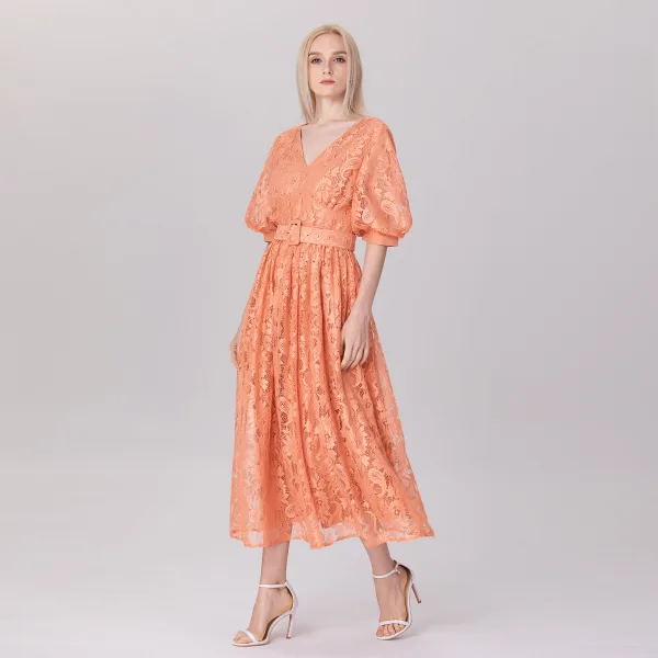 Een vrouwelijk stuk, volledig van kant: gestructureerd met een grote driehoekige pas in de taille en een bijpassende riem, V-hals, een royale rok en pofmouwen. Combineer met sandalen voor een casual stijl of met hakken voor een verfijnde look. Een elegant item dat romantiek toevoegt aan je dag- en avondlook. Productdetails: Vorm: aansluitend en vervolgens uitlopend Lengte: 132 cm V-hals 1/3 mouwen Onzichtbare rits Hoofdmateriaal: 100% polyester Voering: 100% polyester Wastemperatuur maximaal 30°C in een fijnwasprogramma Strijken op lage temperatuur / bleken verboden Niet in de droger
