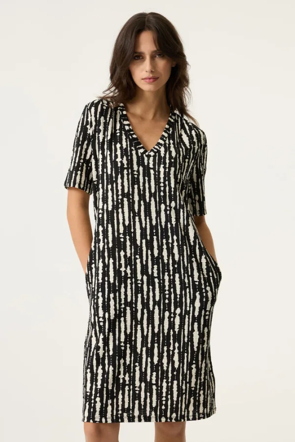 Stijlvolle jurk met een allover print. Deze jurk heeft een V-hals, korte mouwen en een regular fit. Dit item is gemaakt van 96% polyester en 4% elastaan, met een jacquard stof voor een luxe uitstraling. Dit GARCIA kledingstuk is gemaakt met gebruik van recyclede garen. Recyclede materialen worden gemaakt uit restmateriaal, wat weer wordt omgezet tot grondstof.