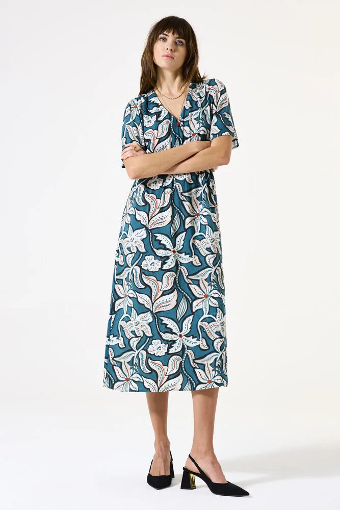 Elegante midi-jurk met een opvallende allover print. Deze jurk heeft een V-hals, korte mouwen en een knoopsluiting, wat zorgt voor een verfijnde uitstraling. De regular fit maakt het een comfortabele keuze voor elke gelegenheid. Dit item is gemaakt van 100% viscose, wat bijdraagt aan een luchtige en soepele drape. Dit GARCIA kledingstuk is gemaakt met LENZING™ ECOVERO™-vezels.