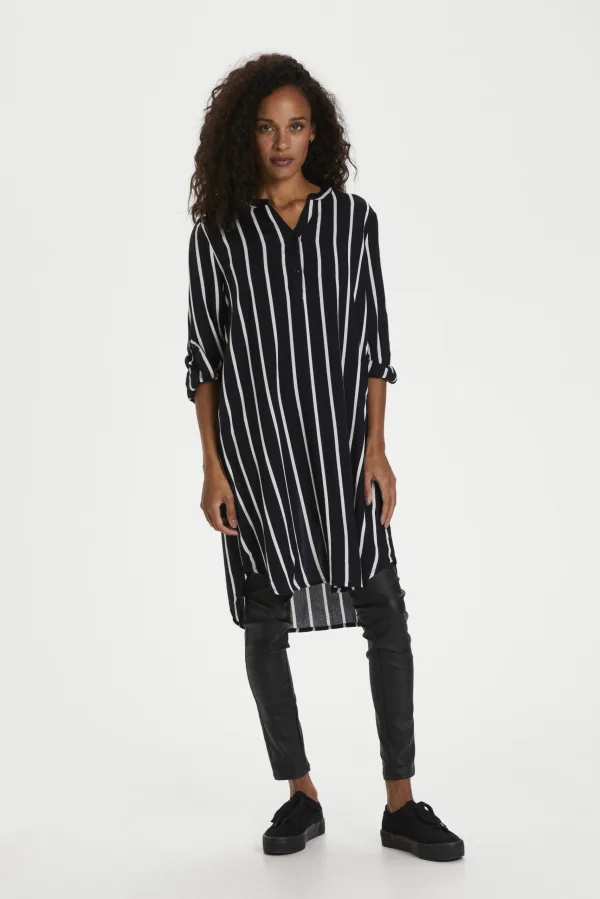 Design: 1-knoops manchetten, Gevoerde zoom/rand, Zijdelingse inkepingen; Type sluiting: Knoopsluiting; Materiaal: Viscose; Halstype: Uitgesneden hals; Motief: Gestreept; Kraag: Zonder kraag; Extra's: All-over patroon, Gladde stof; Lengte: Knielengte; Snit: Recht; Pasvorm: Losse pasvorm; Armlengte: Lange mouw