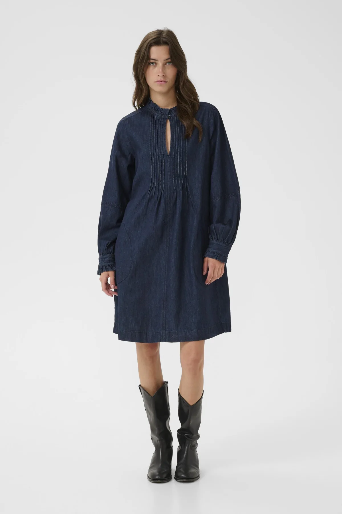 Deze denimjurk heeft een relaxte pasvorm, hoge halslijn, plooidetails en lange mouwen. Comfortabel en veelzijdig, ideaal voor dagelijks gebruik met ceintuur. Fijne was 30°, niet bleken, niet in de droger drogen, Druipnat ophangen in de schaduw, koud strijken max. 110° C, 100% Katoen