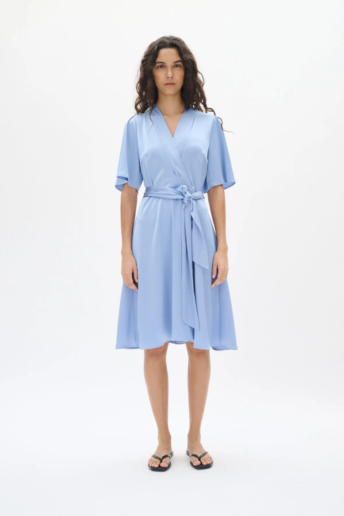 Wikkeljurk met subtiel textuur, korte losvallende mouwen, diepe V-hals, bijpassende strikceintuur en knielange lengte voor een verfijnd effect.
