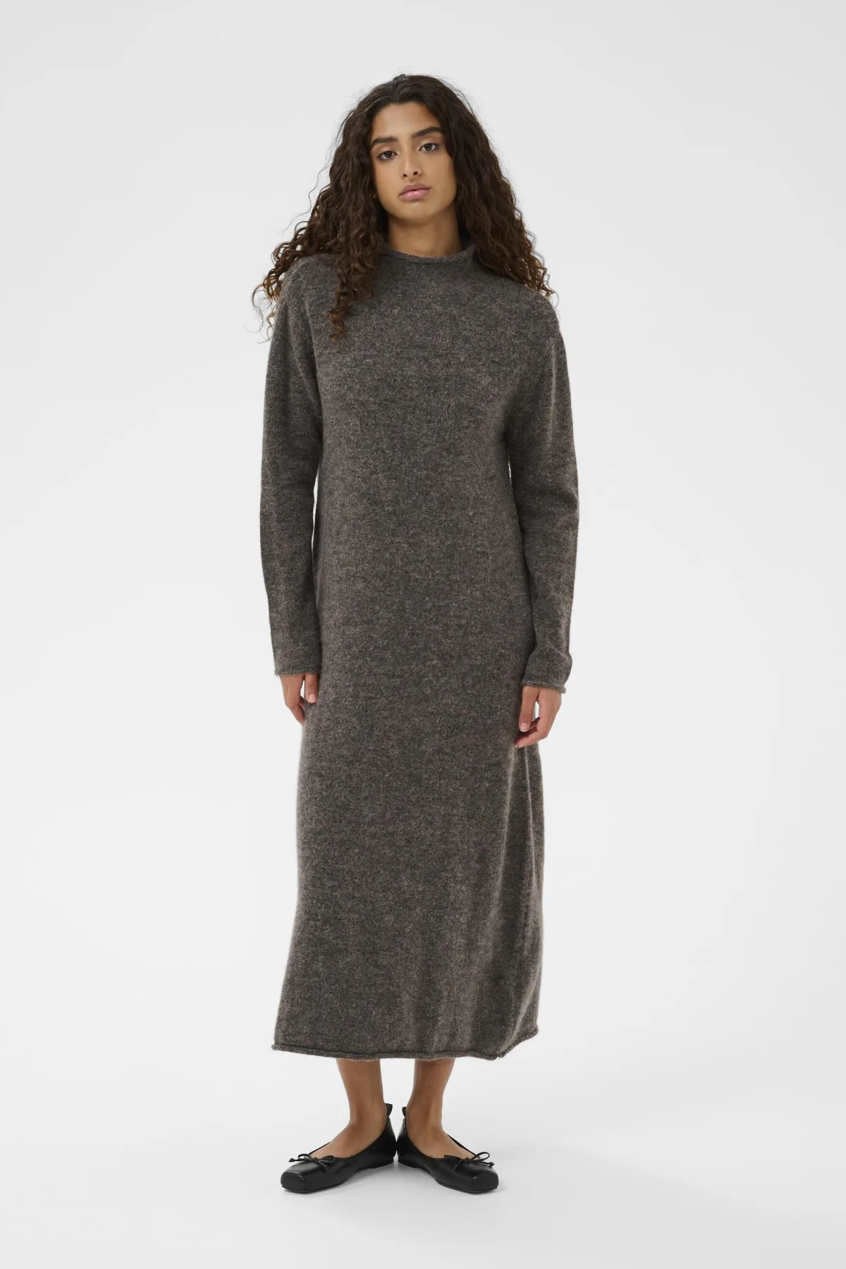 Gebreide jurk met een rechte pasvorm, subtiele opstaande hals en lange mouwen. Midi-lengte en zachte, getextureerde look geven een minimalistische uitstraling.