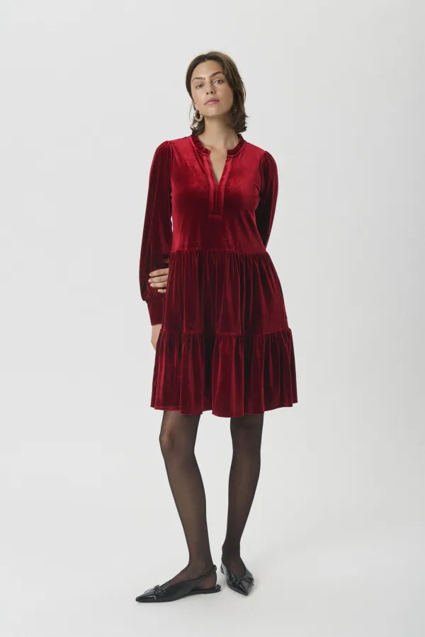 Losvallende jurk met zachte glans, lange ballonmouwen, gerimpelde split-hals en gelaagde rok tot op de knie. Comfort en stijl komen samen.
