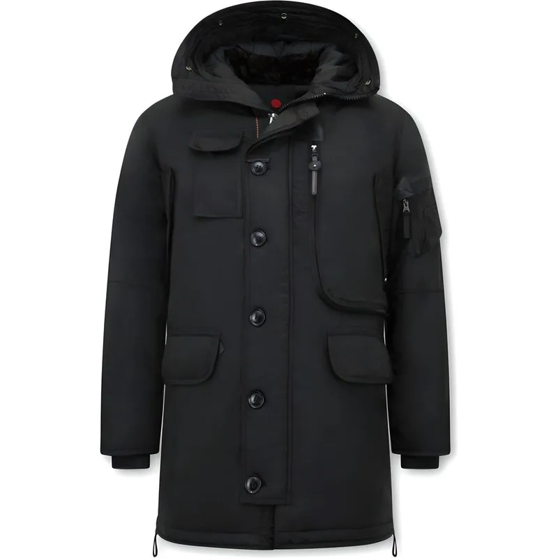 Parka Jas Heren met Capuchon - 1773 - Zwart - Specificaties:- Parka Jas Heren met Capuchon Zwart- Lengte: Lang- Pasvorm: Regular fit- Sluiting: Rits met knopen- Materiaal: Polyester- Voering: 100% Polyester- Zakken: 5 Jaszakken, 1 binnenzak- Seizoen: Winter- Capuchon: Niet afritsbaar- Voorgedrukte knopen / rits aan capuchon. Zelf uit te breiden met nep bontkraag (wordt meegeleverd)- Wasvoorschrift: Machinewas 30 graden / Stomerij- Beschikbare Maten: S - M - L - XL - XXL