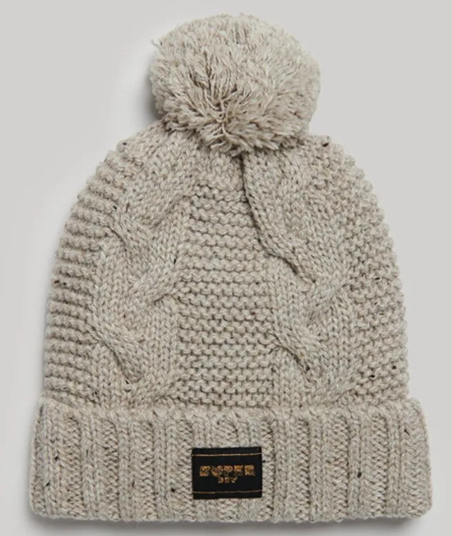 Voeg dit seizoen een vleugje authenticiteit toe als je lekker behaaglijk wilt blijven, met de kabelgebreide beanie. Deze winterbasic tilt je stijl naar een hoger niveau en zorgt voor extra warmte en comfort op winterse avonden. Gebreid in kabelpatroon Wolmix Pompon Voering van imitatiebont Superdry-label