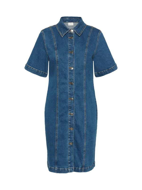 Denim jurk met gestructureerde pasvorm, overhemdkraag, korte mouwen en volledige knoopsluiting. Verticale naden zorgen voor een eigentijdse twist.