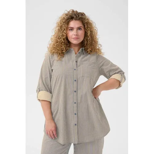 Deze katoenen tuniekblouse van Kaffe Curve is een praktische basis voor je garderobe in het voorjaar. De blouse is uitgevoerd in blauw met een subtiele krijtstreep, wat zorgt voor een rustige uitstraling. De langere tunieklengte valt soepel om het lichaam en sluit aan bij het grote maten assortiment. De stof is gemaakt van 100% katoen, wat zacht aanvoelt op de huid, ook op warmere dagen.Praktische details met een vrouwelijke touch Gemaakt van 100% katoen voor een zachte, ademende stof Blauwe kleur met krijtstreep voor een rustige, klassieke look Lange rechte mouwen met oprolfunctie voor extra draaggemak Klassieke kraag en volledige knoopsluiting aan de voorkant Borstzak als extra detail en handig opbergvakje Onderdeel van een co-ord set of pak voor een afgestemde outfit Speciaal ontwikkeld binnen het grote maten assortimentVeelzijdig te dragen tuniekblouseDeze KCnana tuniek past goed bij een smalle broek of een nette pantalon. De oprolmouwen maken het gemakkelijk om je look aan te passen, van opgerold tot lang. Geschikt voor dagelijkse momenten, kantoor of een lunchafspraak in de stad.Kaffe Curve: stijl voor grotere matenKaffe Curve richt zich op mode in grotere maten met aandacht voor pasvorm en vrouwelijke lijnen. De collecties sluiten aan bij het huidige modebeeld en bieden kleding die goed aansluit op het lichaam en een verzorgde indruk geeft. Zo voeg je eenvoudig eigentijdse items toe aan je kast, passend bij jouw stijl.Een blouse die het hele seizoen door goed van pas komt.