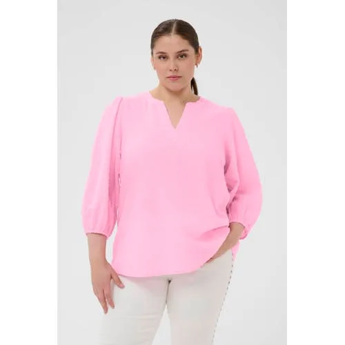 Breng kleur in je garderobe met deze Kaffe Curve katoenen blousetop in roze. De top is gemaakt van 100% katoen, wat zorgt voor een zachte, luchtige feel op de huid. De effen roze kleur geeft een frisse, vrouwelijke uitstraling die mooi past bij het lenteseizoen. De V-hals en de losvallende snit laten de hals en schouders subtiel uitkomen en geven een ontspannen look.Luchtige blouse met pofmouwen Gemaakt van 100% katoen voor een ademend en prettig draaggevoel Driekwart pofmouwen zorgen voor een speels silhouet rond de armen V-hals die het decolleté zacht accentueert zonder diep te vallen Effen roze kleur, makkelijk te combineren met basic broeken en jeans Blousetop zonder zakken voor een rustige, cleane uitstraling Onderdeel van de 'Feminine' collectie en speciaal ontworpen voor grote matenRelaxte look voor elke dagDe roze blousetop is ideaal voor een dag op kantoor, een etentje of gewoon een ontspannen dag thuis. Draag de top op een donkere jeans voor contrast of combineer met een lichte chino voor een zachte, ton-sur-ton look. De driekwart mouwen zijn handig als je graag vrij beweegt zonder steeds je mouwen op te hoeven stropen.Kaffe Curve voor grote matenKaffe Curve richt zich op vrouwen die mode in grote maten zoeken met een vrouwelijke uitstraling en doordachte details. De pasvormen worden speciaal afgestemd op rondere vormen, zodat tops, jurken en blouses mooi vallen en prettig aanvoelen. Met deze blousetop van Kaffe Curve voeg je een draagbaar en eigentijds item toe aan je kledingkast.Een luchtige favoriet voor dagen waarop je iets wilt dragen dat zowel verzorgd als comfortabel aanvoelt.