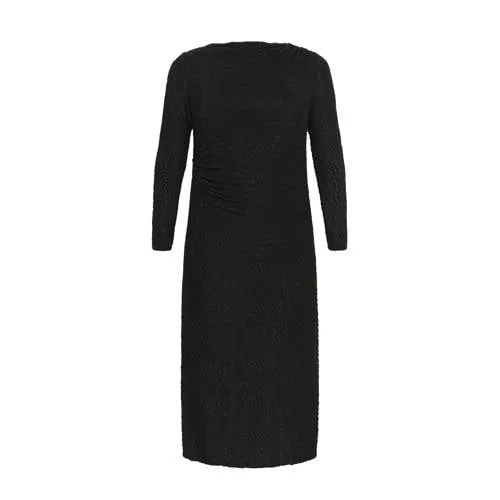 Deze midi-jurk met lange mouwen heeft een regular fit en drapering bij de hals. Subtiele plooien en structuren geven elegantie en draagcomfort, ideaal voor elke gelegenheid.