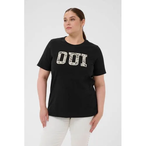 Het zwarte Kaffe Curve KClucie T-shirt is een fijne basic voor elke dag, speciaal ontworpen voor dames met een grotere maat. De rechte pasvorm valt soepel langs je lichaam en geeft een rustige, moderne look. Dankzij de ronde hals en korte, rechte mouwen oogt dit shirt casual en toch verzorgd. Het tekstdetail op de voorkant zorgt voor een subtiel accent, zonder te overheersen.Zacht katoen en ontspannen pasvorm Gemaakt van 100% katoen, een zachte stof die prettig aanvoelt op de huid Rechtvallend model voor een ontspannen, comfortabele fit Ronde hals voor een tijdloze, vrouwelijke uitstraling Korte, rechte mouwen die netjes langs de armen vallen Zwarte kleur die makkelijk combineert met jeans, rok of pantalon Tekstprint aan de voorkant als subtiele blikvangerVeelzijdig zwart T-shirt voor elke dagDit T-shirt past bij een drukke dag vol afspraken, een relaxte vrije dag of een casual kantoorlook. Draag het los over een jeans voor een ontspannen uitstraling of stop het gedeeltelijk in je broek of rok voor net wat meer vorm. De zwarte kleur maakt combineren eenvoudig, het shirt vormt een rustige basis in je garderobe.Kaffe Curve: stijl in grotere matenKaffe Curve richt zich op dames met een grotere maat en brengt modieuze items met herkenbare pasvormen. De collecties sluiten aan op de trends van het seizoen, maar blijven draagbaar en toegankelijk. Zo kun je vertrouwen op kleding die goed zit en er verzorgd uitziet.Een tijdloos T-shirt waar je het hele seizoen op kunt bouwen.