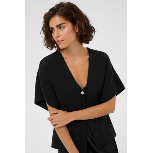 Dit zwarte Kaffe dames vest is een veelzijdig item voor allerlei momenten op de dag. Het korte, gebreide model met V-hals valt mooi rond je bovenlichaam en is ideaal om over een top of jurk te dragen. De effen kleur en rustige uitstraling maken het vest geschikt voor zowel kantoor als een ontspannen dag thuis.Details die je elke dag draagt Kort vest, mooi te combineren met een hoge taille broek of rok V-hals die ruimte laat voor een ketting of top met kant Knoopsluiting aan de voorkant voor open of dicht te dragen Korte, rechte mouwen voor een luchtig gevoel in het voorjaar Gebreide kwaliteit met een zachte touch Effen zwarte kleur, makkelijk te combineren in je garderobe Geen zakken voor een rustige, vrouwelijke uitstralingVeelzijdig vest voor lente en frisse dagenDit vest past goed bij de lichtere lagen van het voorjaar. Draag het over een top met spaghettibandjes, een basic T-shirt of een zomerse jurk. Door het korte model blijft je taille zichtbaar, wat ook mooi staat op een luchtige pantalon of een soepel vallende rok.De stijl van KaffeKaffe staat bekend om vrouwelijke items met een moderne, draagbare twist. De collecties sluiten aan op het dagelijks leven, met kleding die je makkelijk combineert en vaak uit de kast pakt. Zo voeg je met dit vest een betrouwbaar basisstuk toe aan je collectie, dat seizoen na seizoen mee kan.Een gebreid vest dat je garderobe op een eenvoudige manier aanvult.