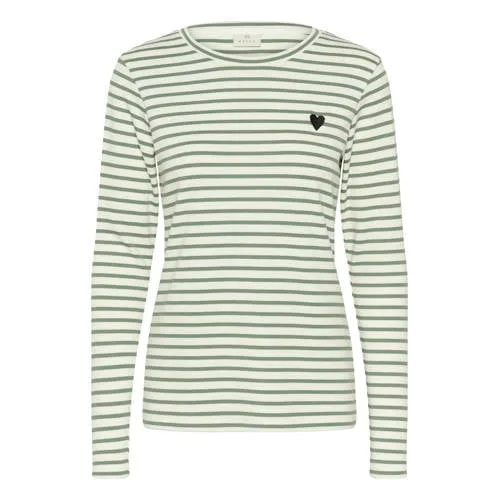 Geef je voorjaarsgarderobe een frisse update met deze Kaffe gebreide dames top met lange mouw. De groen met witte strepen zorgen voor een helder, modern beeld en de rechte mouwen en ronde hals maken de top geschikt voor elke dag. Door de gebreide structuur oogt het model iets voller dan een T-shirt, maar voelt het toch licht en soepel op de huid.Details die het verschil maken Top met lange mouwen en rechte pijpen, ideaal voor wisselvallig weer Groen/witte streepprint voor een heldere, klassieke uitstraling Ronde hals die mooi aansluit zonder te hoog te sluiten Gemaakt van katoen, viscose en elastaan voor een zachte touch en lichte stretch Gebreide kwaliteit die net wat meer structuur geeft dan een basic T-shirt Valt binnen de 'Feminine' collectie, met een vrouwelijke, toegankelijke stijlGemakkelijk te stylen in het dagelijks levenDeze gestreepte top is een praktische basis voor je dagelijkse outfits. Combineer met een lichtblauwe jeans voor een casual combinatie, of draag hem in een nette broek voor een meer verzorgde look. Ook onder een blazer of een dun vest komt de subtiele streep goed uit, zonder dat het druk oogt.Kaffe: Scandinavische eenvoud met aandacht voor detailKaffe staat bekend om kleding met een duidelijke, Scandinavische signatuur. Eenvoudige lijnen, doordachte details en draagbaarheid in het dagelijks leven staan daarbij centraal. Dankzij de herkenbare stijl zijn de items van Kaffe seizoen na seizoen goed te combineren.Een comfortabele, gestreepte basic die je gemakkelijk pakt voor zowel werk als vrije tijd.