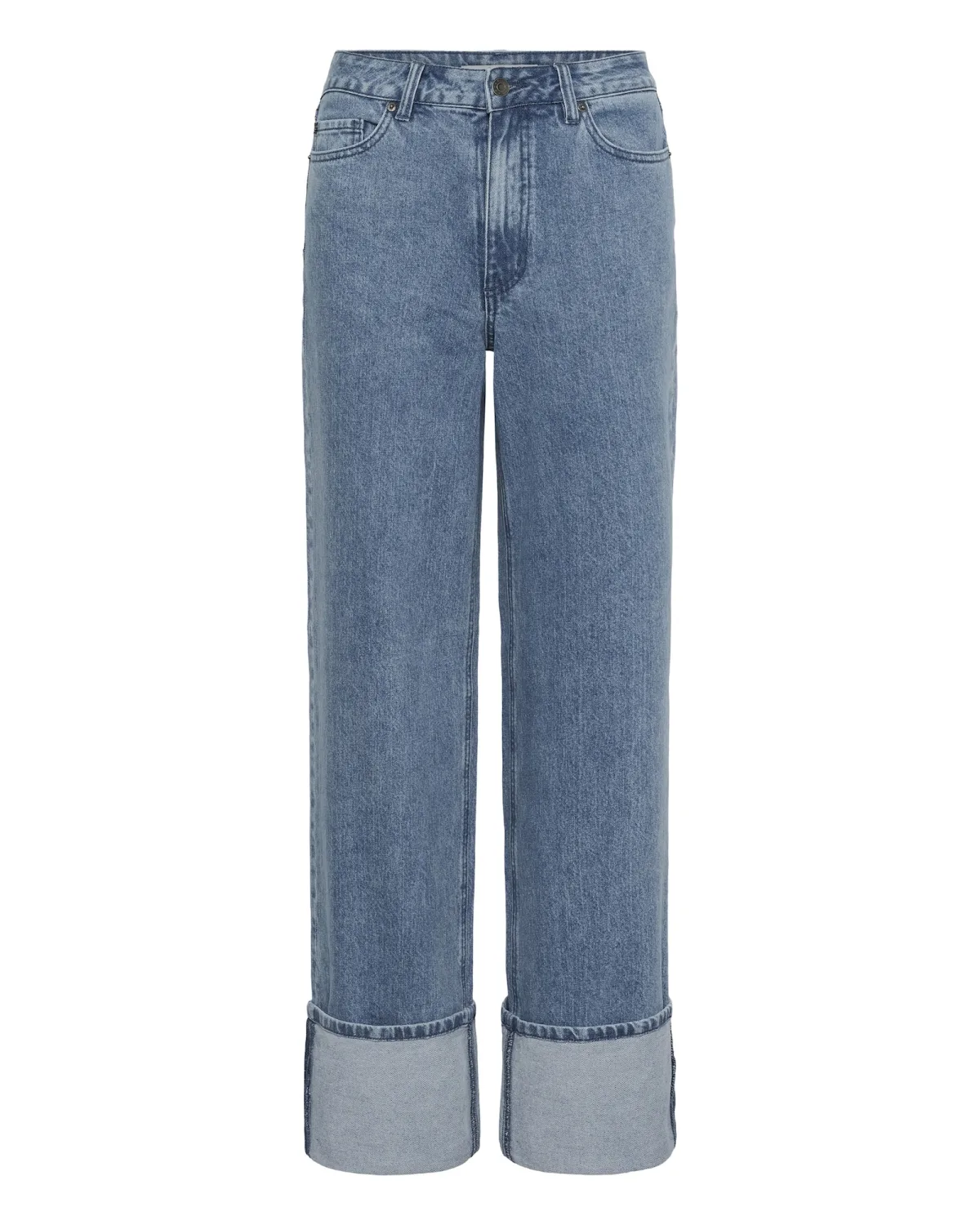 Design: Omgeslagen zoom, Ritssluiting, 5-pocket-style, Knop sluiting; Type sluiting: Ritssluiting; Materiaal: Katoen; Motief: Effen; Extra's: Contrasterende naden, Label patch/label flag, Riemlussen; Wassing: Blauw denim; Lengte: Lang/maxi; Pasvorm: Wide leg; Taillehoogte: Mid waist
