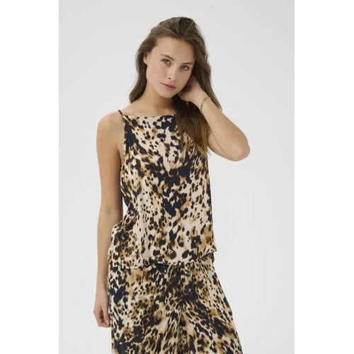 Dierlijk patroon top met een vloeiende snit, rechte hals en fijne schouderbandjes. Lichtgewicht textuur en een ruime val voor een zelfverzekerde stijl.