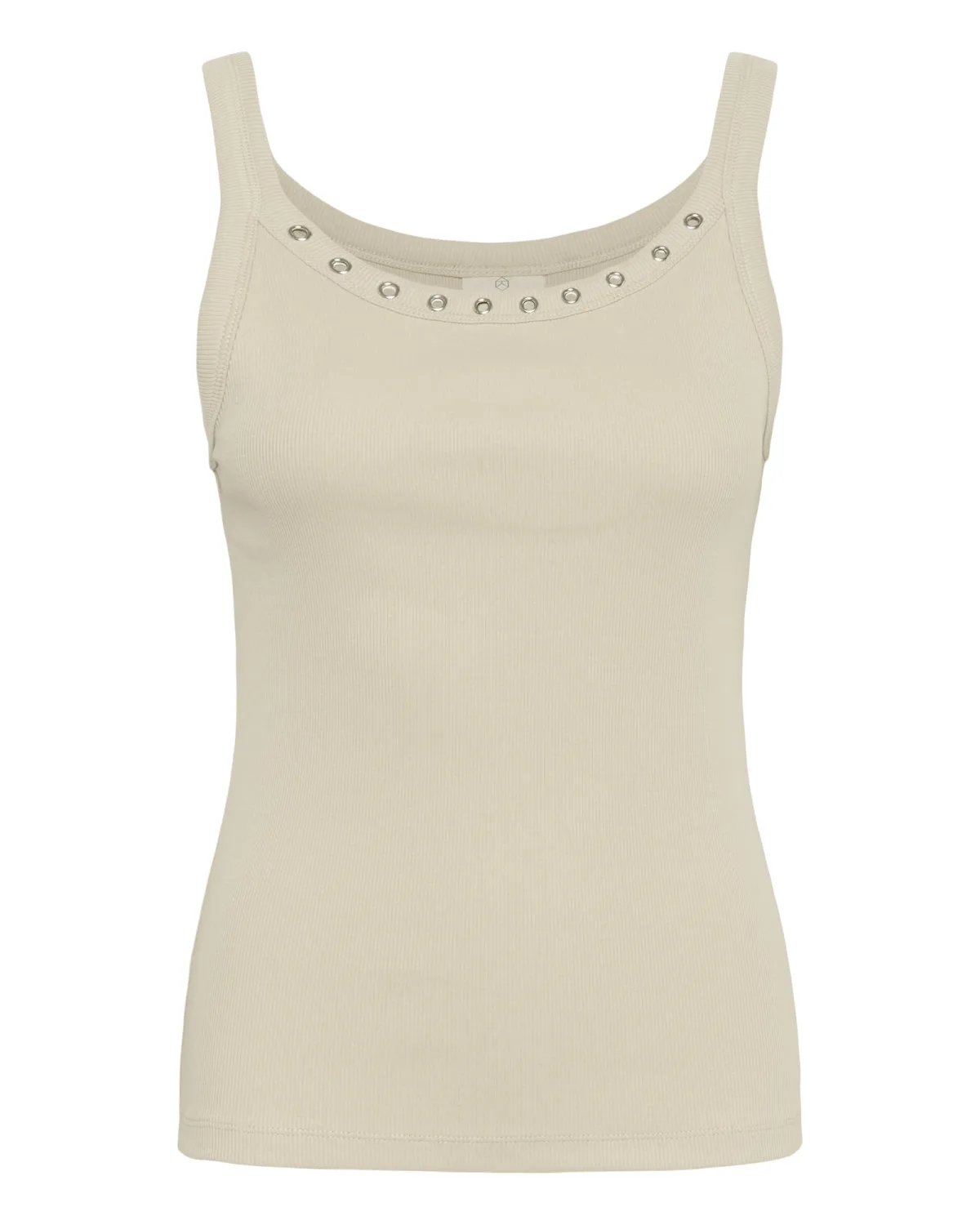 Design: Geribbeld gebreid; Materiaal: Jersey; Halstype: Ronde hals; Motief: Effen; Soort bandjes: Normale bandjes; Extra's: Metalen oogjes; Pasvorm: Slanke pasvorm; Armlengte: Mouwloos; Lengte: Normale lengte