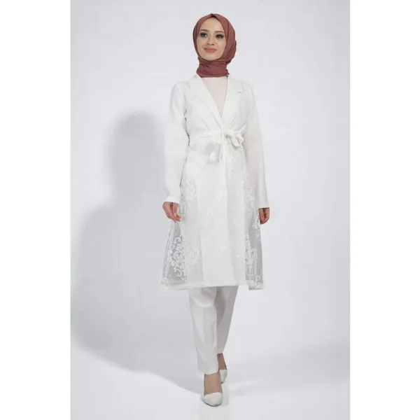 Stofkenmerk: Gemaakt van crêpe en kant. Productkenmerk: Nieuwe seizoens hijab modeproduct en niet gevoerd. De jas heeft een afneembare riem. De broek heeft een ritssluiting aan de voorkant en één knop. De productkleur kan verschillen door conceptopnames. Het model draagt maat 38. Maat 38 Jas Maten: Productlengte: 105 cm - Borst: 96 cm - Taille: 82 cm - Heupen: 98 cm Maat 38 Broek Maten: Productlengte: 102 cm - Taille: 80 cm - Heupen: 94 cm Maatmaten worden 3 of 4 cm groter. (Productlengte verandert niet)