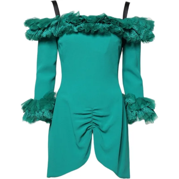 Draai hoofden om, steel de show en bezit de nacht in deze prachtige minijurk. Ervaar ongeëvenaarde elegantie en zelfvertrouwen. Gemaakt van hoogwaardige crêpe stof, beschikt deze jurk over een chique off-the-shoulder halslijn en elegante driekwartmouwen. De mooie kant- en tulevolants voegen een vleugje drama toe, zodat je een blijvende indruk achterlaat. De flatterende silhouet accentueert je figuur, terwijl de rijke teal kleur verweert sophistication uitstraalt. Perfect voor speciale gelegenheden, belooft deze jurk een comfortabele pasvorm en tijdloze stijl. Stap in moeiteloze glamour en maak elk moment onvergetelijk.
