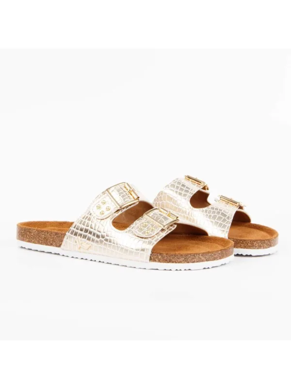 Kaporal Croco damesschoen van goudkleurig synthetisch materiaal. Authentieke Kaporal merkschoen - streetwear/sportswear design van Kaporal - Kaporal voor modebewuste vrouwen, perfect voor dagelijks gebruik - de gouden Kaporal claquette is perfect te combineren met je garderobe - comfortabele synthetische materialen - klassieke gesp - krokodillenleer.