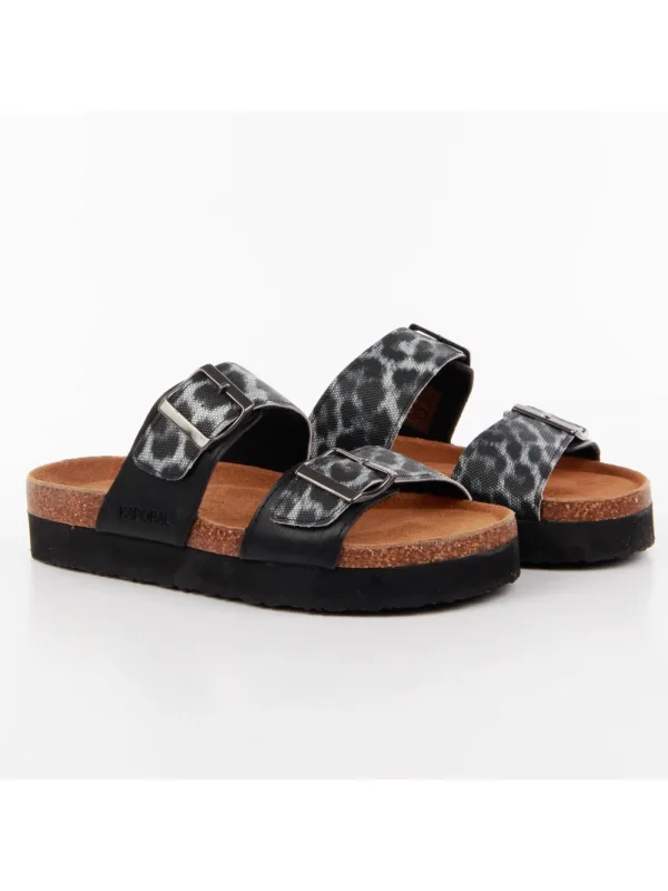 Kaporal Leopard damesslippers, zwart synthetisch. Authentieke Kaporal merkschoen - streetwear/sportwear design van Kaporal - modieuze Kaporal voor dames, perfect voor dagelijks gebruik - de zwarte Kaporal slippers passen perfect bij de rest van je garderobe - comfortabele synthetische materialen - klassieke gesp - luipaardprint - synthetisch