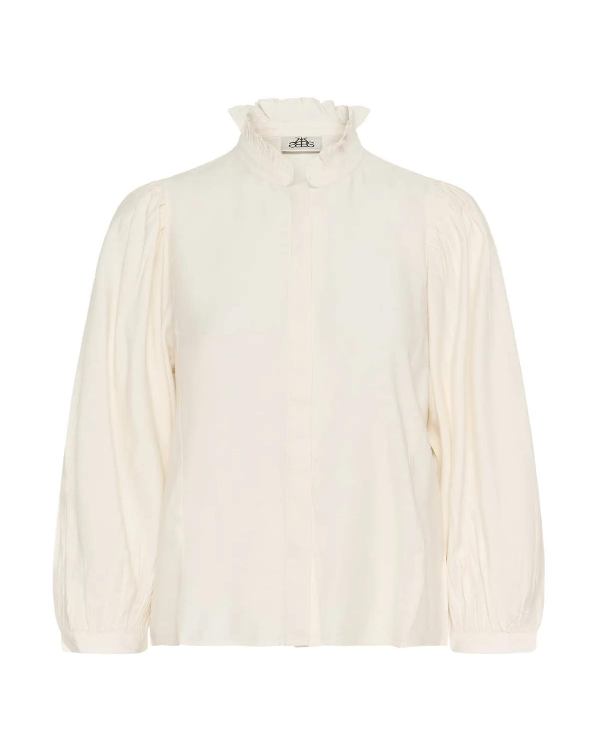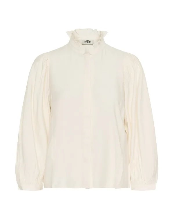 Blouse met rechte pasvorm, hoge kraag met ruches, verborgen knoopsluiting en volumineuze mouwen met plooien en brede manchetten.