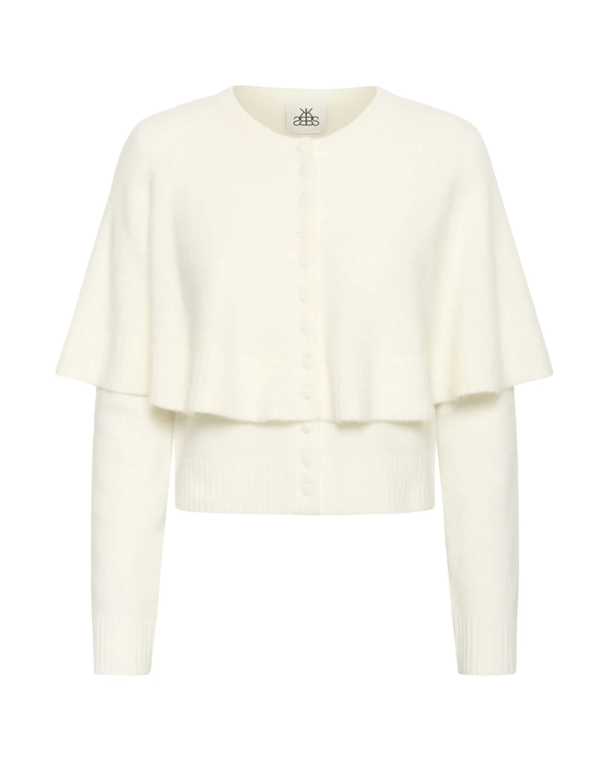 Dit vest combineert een boxy cropped pasvorm met een opvallende cape-overlay. Klassieke ronde hals, volledige knoopsluiting en geribbelde boorden.