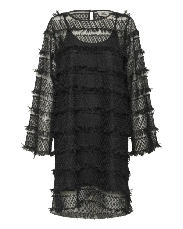 Mesh jurk in rechte pasvorm met gelaagde franjes en geometrisch structuurdesign. Halftransparante mouwen en lijf voor een eigentijds silhouet.