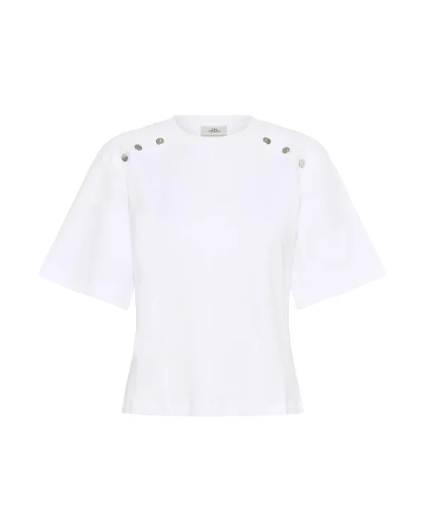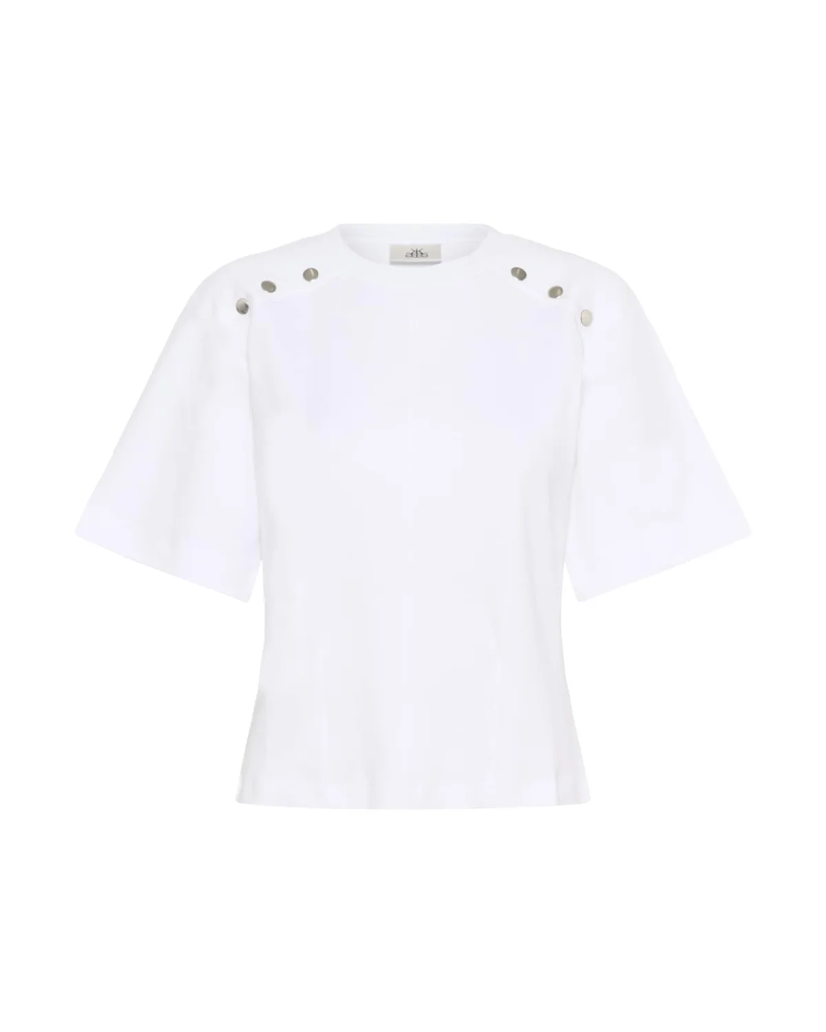 Boxy top met opvallende metalen oogjes langs de schoudernaden. Ronde halslijn, rechte zoom en korte, wijde mouwen geven een moderne look.