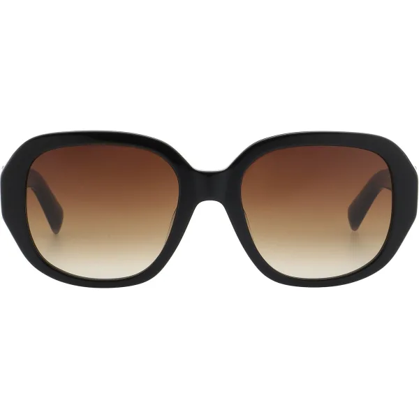 Grote hexagonale zonnebril van Karen Millen, hier weergegeven in klassiek zwart met transparante grijze pootjes die een gouden gespdetail hebben en flatterende, warme bruine, gradient glazen. Kan worden voorzien van voorgeschreven lenzen.