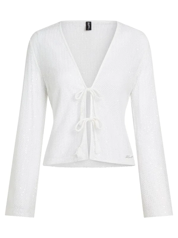 Design: Diepe snit/decolleté, Om te knopen/binden; Materiaal: Gehaakt; Halstype: V-hals; Motief: Effen; Details: Pailletten, Mesh; Extra's: Label plaatje, Sterk transparant; Pasvorm: Slanke pasvorm; Armlengte: Lange mouw; Lengte: Normale lengte